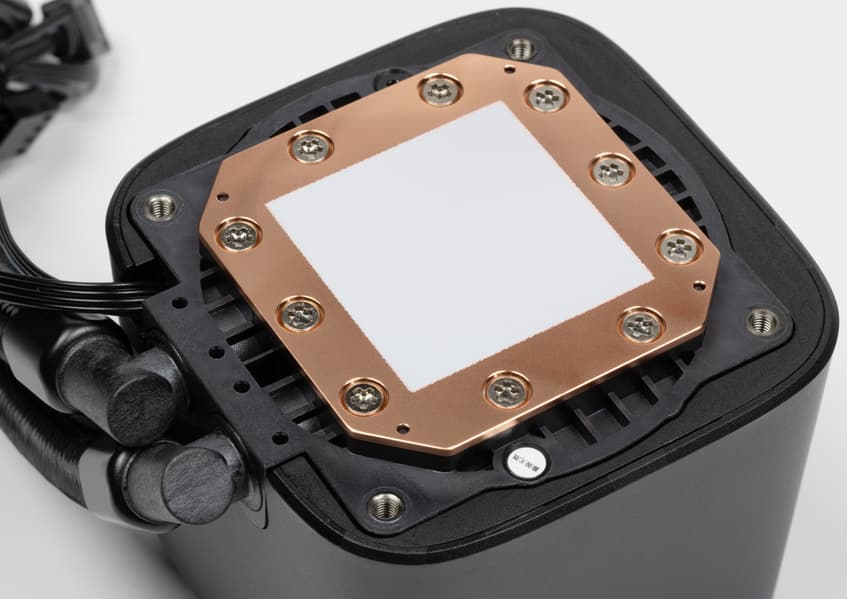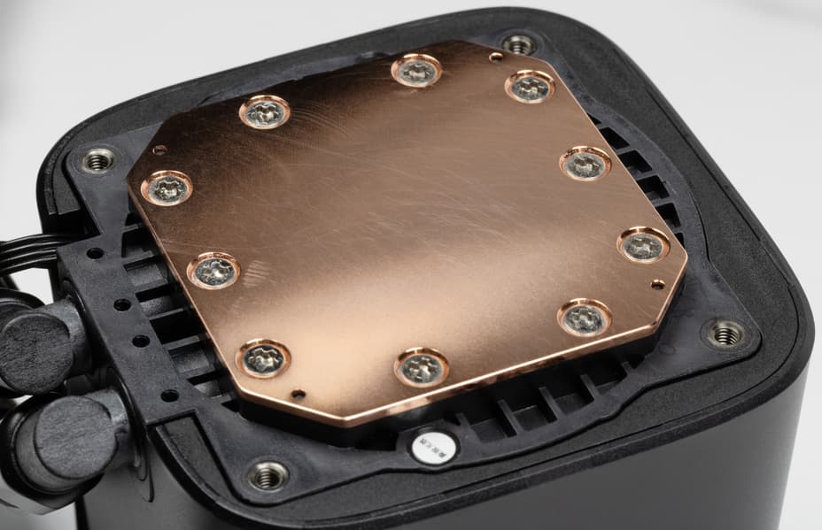 Система герметичная, заправлена, готова к использованию. Помпа интегрирована в один блок с теплосъемником. Подошвой теплосъемника, непосредственно прилегающей к крышке процессора, служит медная пластина. Ее внешняя поверхность ровная, шлифованная и слегка полированная. К центру она выпуклая с перепадом порядка 0,2-0,3 мм.