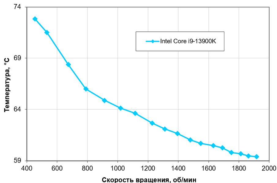 В этом тесте процессор Intel Core i9-13900K очень далек от перегрева (при 24 °C окружающего воздуха) во всем диапазоне оборотов вентиляторов. При этом максимальное потребление по данным мониторинга составило порядка 212 Вт, а по разъемам для питания процессора — 277 Вт. Напомним, что базовая мощность этого процессора в полностью штатном режиме составляет всего 125 Вт, а максимальная кратковременная (турбо-лимит) — 253 Вт.
