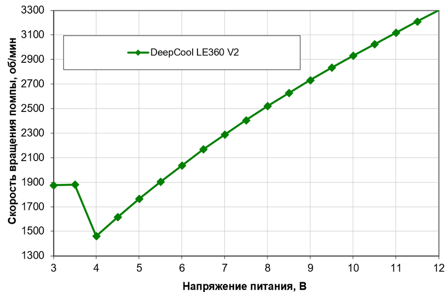 И при снижении напряжения помпа героически старается удерживать скорость вращения на уровне выше половины максимальной. Насколько уж получается — поскольку ниже 3 В помпа вообще отключается. При 5 В имеем чуть-чуть больше половины, так что к источнику питания с таким напряжением помпу подключать можно. Но, как нам кажется, не слишком-то нужно — в данном случае лучше положиться на ШИМ.