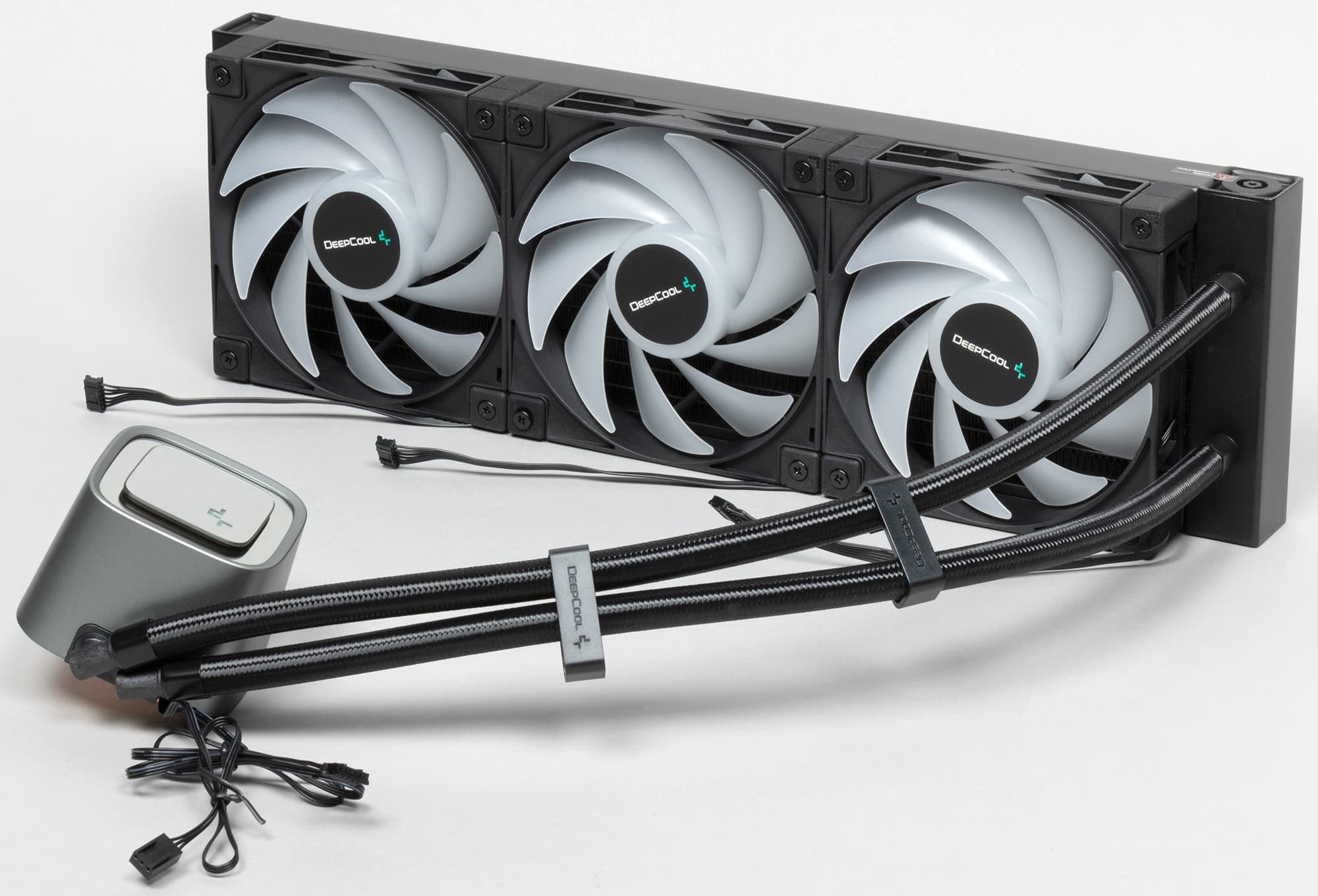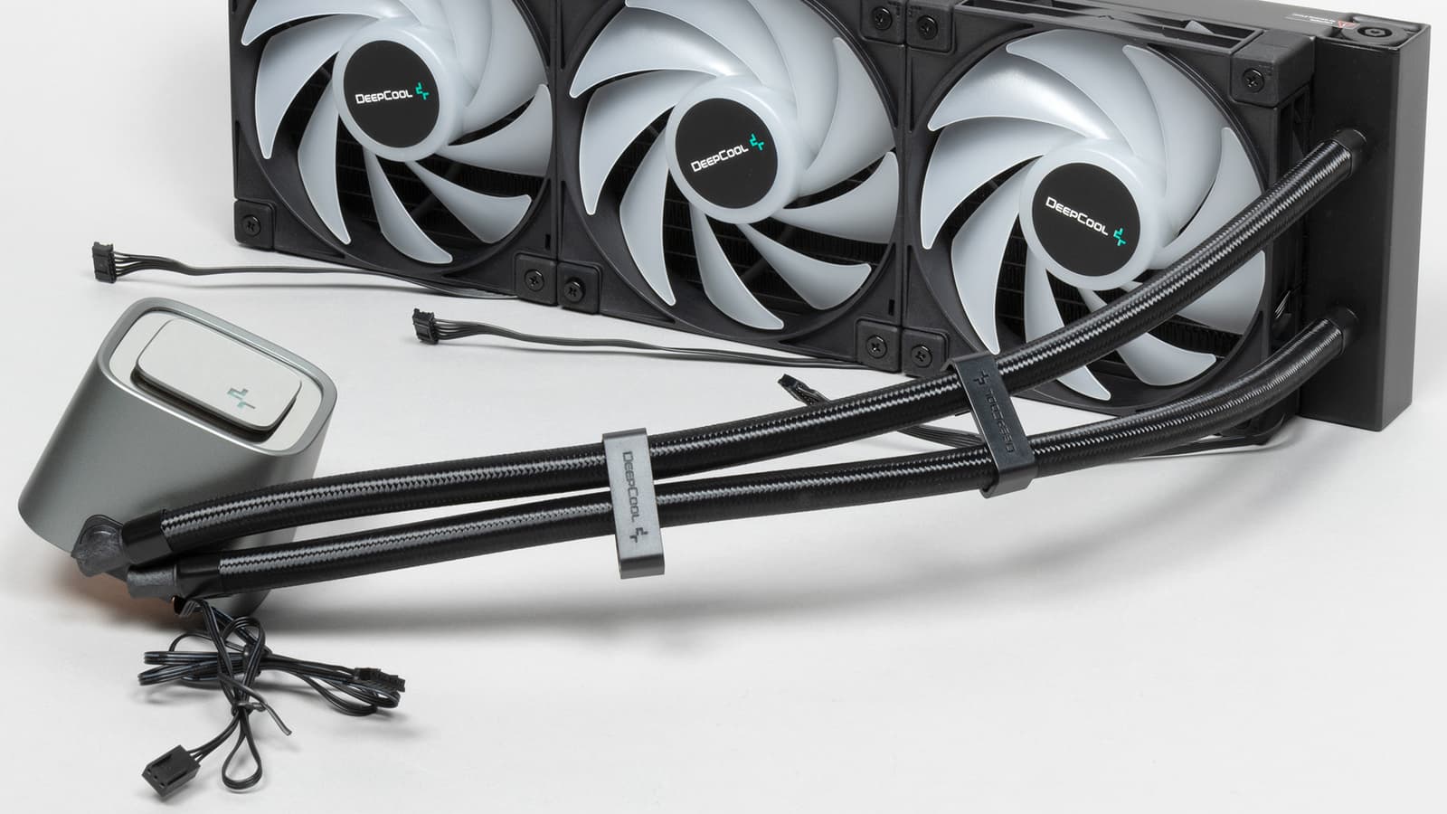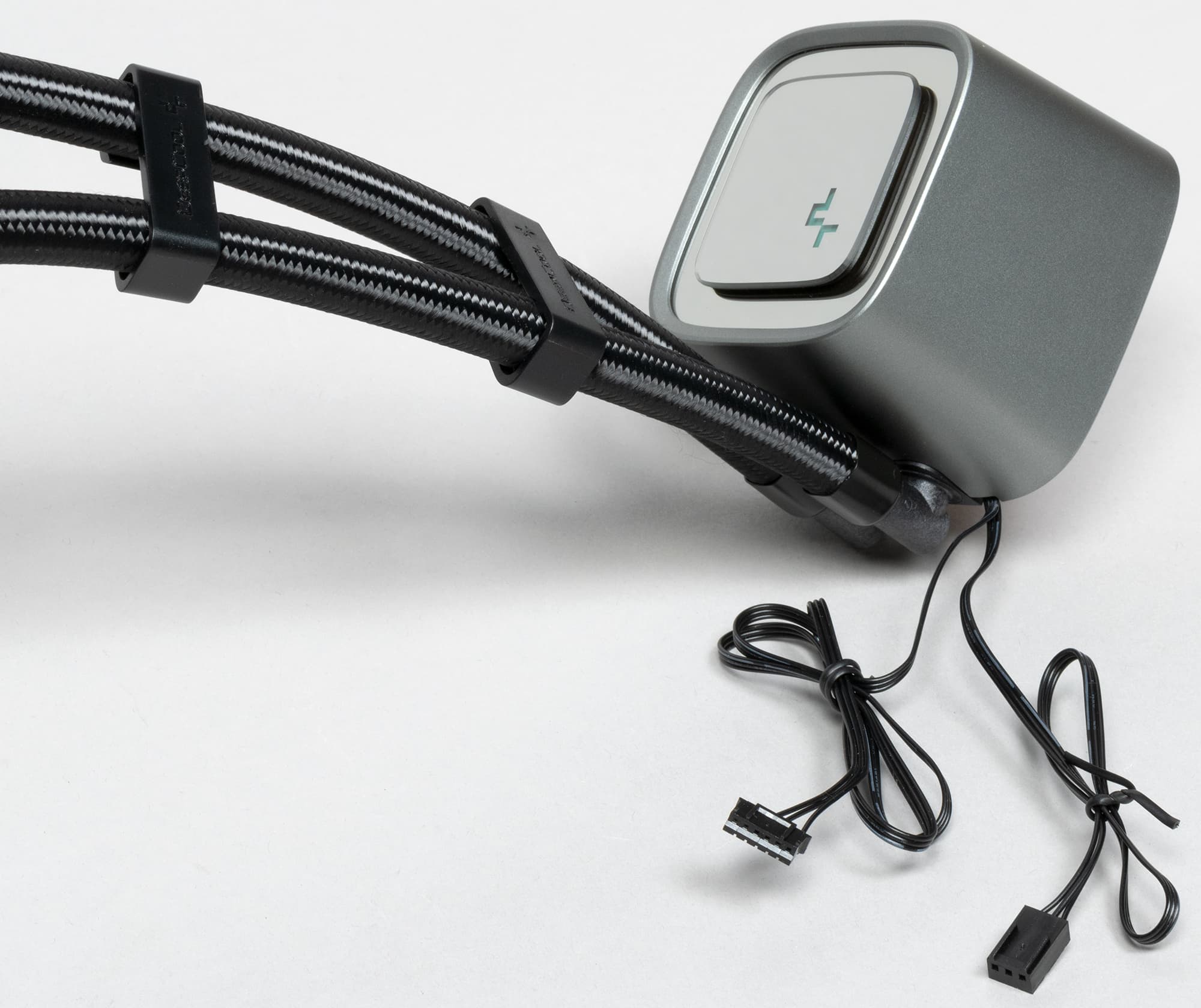 Вентилятор имеет шестиконтактный разъем (общий, питание мотора, датчик вращения, управление ШИМ, данные подсветки, питание подсветки) на конце плоского кабеля длиной всего 16,5 см. Также на вентиляторе есть проходной разъем, в котором отсутствует контакт датчика вращения. Малая длина кабеля обусловлена оригинальной схемой подключения: первый (от ввода шлангов) вентилятор на радиаторе своим кабелем подключается к следующему в проходной разъем, тот — к следующему и только кабель от третьего вентилятора подключается к многофункциональному разветвителю (отслеживается скорость вращения только этого вентилятора). От разъема на этом разветвителе отходит три кабеля: к разъему для вентилятора на системной плате (35 см; используется только датчик вращения), к разъему питания SATA (35 см; используется только 12 В), к разъему для управления адресуемой подсветкой на системной плате (35 см; плюс ответвление 10 см с проходным разъемом для подключения следующих устройств в цепочке). Если длины этих ответвлений не хватит, то можно использовать удлинительный кабель (40 см), который подключается между третьим вентилятором и разветвителем. При этом кабель подсветки от помпы подключается к проходному разъему на первом вентиляторе (используются только контакты общий, данные подсветки, питание подсветки). Мотор от помпы подключается непосредственно к разъему для вентилятора на системной плате (общий, питание, датчик вращения).