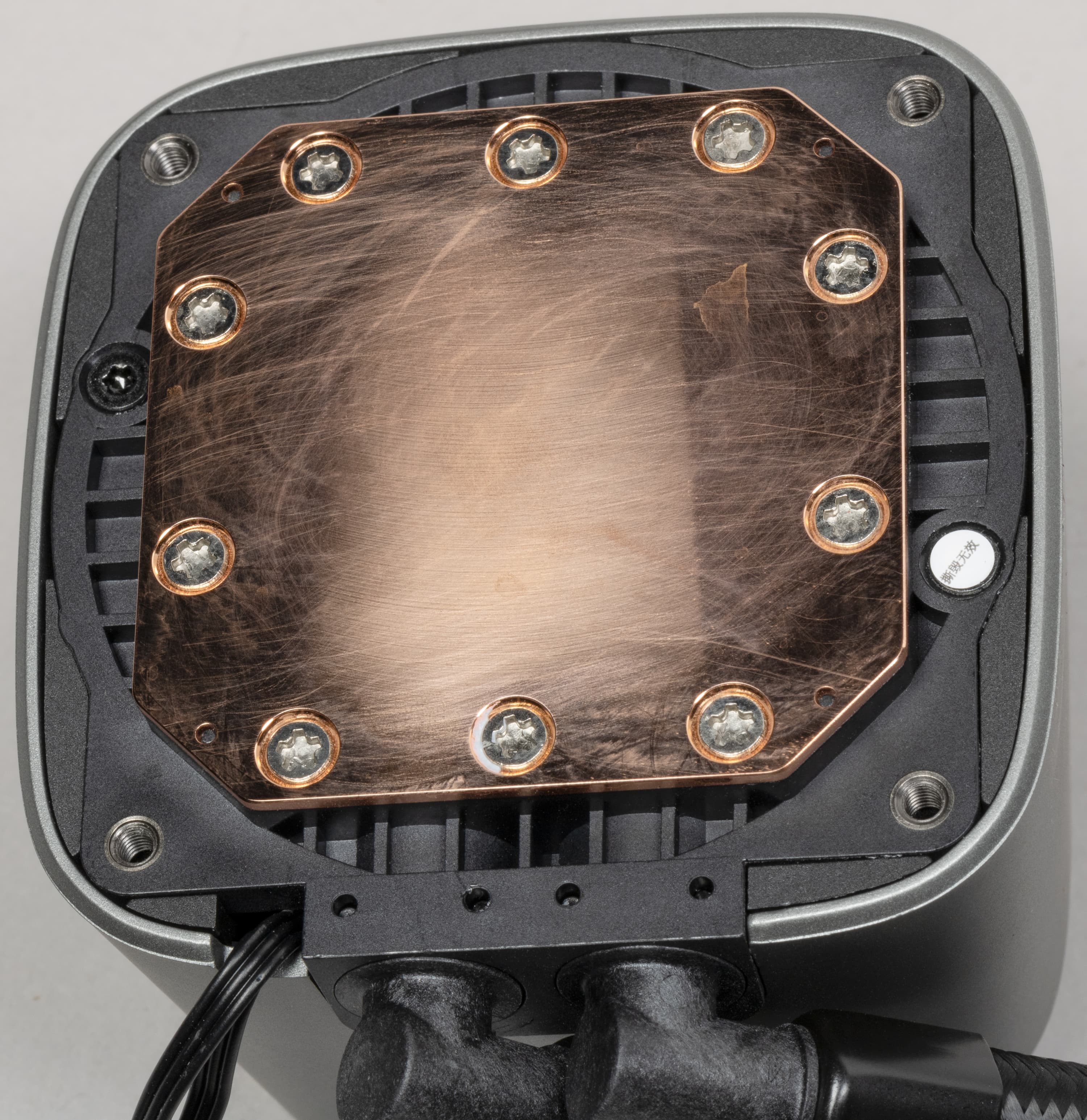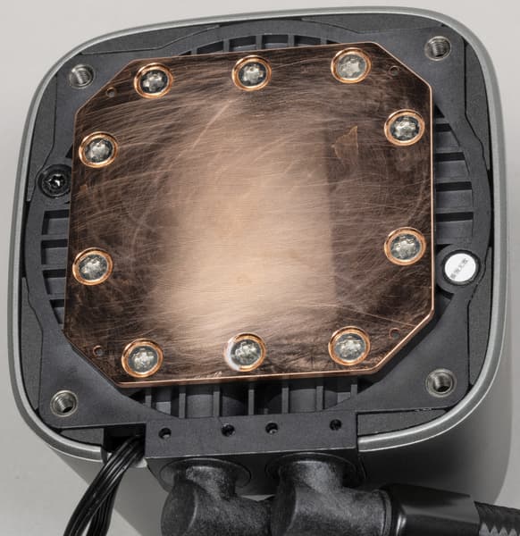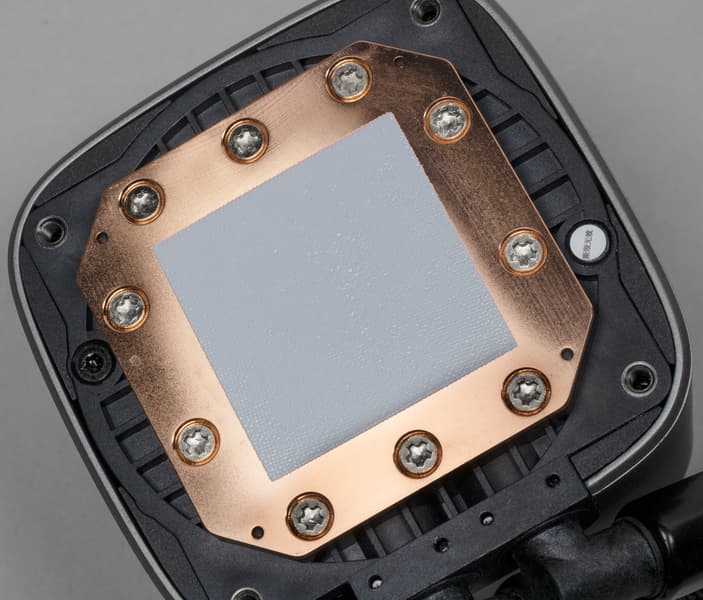 Система герметичная, заправлена, готова к использованию. Помпа интегрирована в один блок с теплосъемником. Подошвой теплосъемника, непосредственно прилегающей к крышке процессора, служит медная пластина. Ее внешняя поверхность ровная, шлифованная и слегка полированная. К центру она выпуклая с перепадом порядка 0,2 мм.