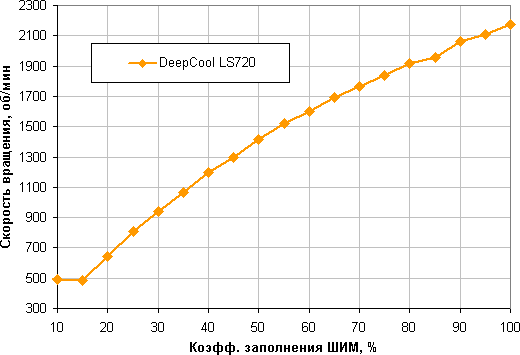 Хороший результат — монотонный рост скорости вращения при изменении коэффициента заполнения от 15% до 100%, диапазон регулировки скорости вращения широкий. При снижении коэффициента заполнения (КЗ) до 0% вентиляторы не останавливаются. Это может иметь значение, если пользователь хочет создать гибридную систему охлаждения, которая при низкой нагрузке работает полностью или частично в пассивном режиме.