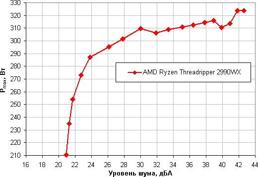 Ограничившись указанными выше условиями, построим зависимость реальной максимальной мощности (обозначенной как Pmax), потребляемой процессором, от уровня шума уже в случае AMD Ryzen Threadripper 2990WX: