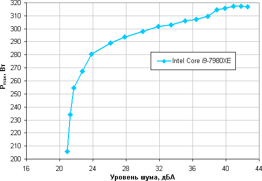 Приняв 25 дБА за критерий условной бесшумности, получим примерную максимальную мощность процессоров, соответствующих этому уровню. Это порядка 285 Вт для процессора Intel Core i9-7980XE. Если не обращать внимания на уровень шума, то пределы мощности можно увеличить где-то до 315 Вт. Еще раз уточним, это в жестких условиях обдува радиатора нагретым до 44 градусов воздухом, при снижении температуры воздуха указанные пределы мощности для бесшумной работы и максимальной мощности возрастают.