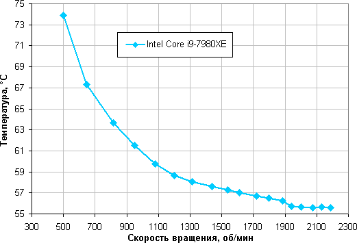 В этом тесте наш процессор с TDP 140 Вт не перегревается (при 24 градусов окружающего воздуха) на оборотах вентиляторов, достигаемых при снижении КЗ до 15%, что соответствует примерно 500 об/мин.