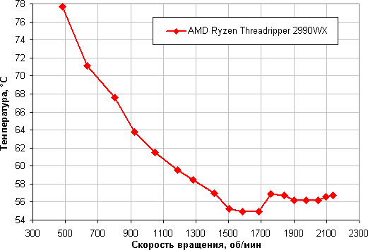 Зависимость температуры процессора AMD Ryzen Threadripper 2990WX при его полной загрузке от скорости вращения вентиляторов: