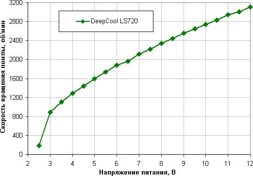В случае тестов под нагрузкой и при измерении уровня шума скорость вращения вентиляторов изменялась с помощью ШИМ при изменении КЗ в диапазоне от 100% до 15% с шагом в 5%. Помпа работала от 12 В.