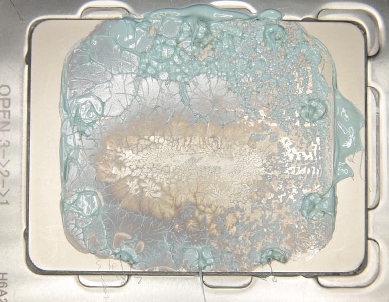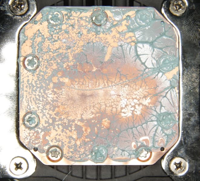 Видно, что термопаста распределилась тонким слоем на всю площади крышки процессора, а ее избытки выдавились за края. Участок плотного контакта расположен примерно по центру и имеет большую площадь. Отметим, что крышка этого процессора сама по себе чуть выпуклая к центру. (Распределение термопасты, конечно, немного изменилось при разъединении процессора и помпы.)
