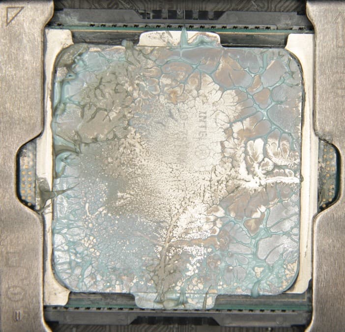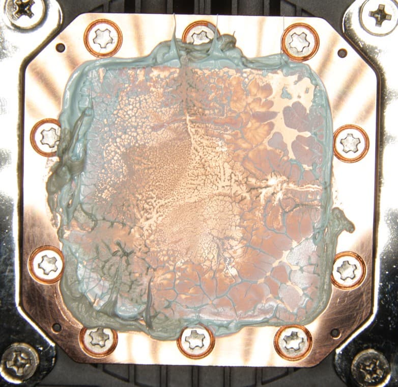 Запаса для ее восстановления в комплекте поставки, к сожалению, нет. В тестах использовалась не менее качественная термопаста другого производителя. Забегая вперед, продемонстрируем распределение термопасты после завершения всех тестов. На процессоре Intel Core i9-7980XE: