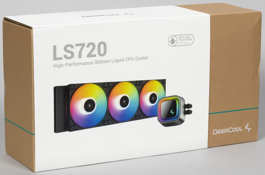 Поставляется система жидкостного охлаждения DeepCool LS720 в коробке из среднего по толщине гофрированного картона. Поверх коробки надет шубер (суперобложка), на котором в цвете изображен сам продукт, а также перечислены основные технические характеристики, приведено описание системы антипротечки (встроенный в радиатор гидроамортизатор) и другая дополнительная информация. Почти все надписи на английском языке и только отсылка на сайт компании за дополнительной информацией продублирована на нескольких языках, включая русский. Для защиты и распределения деталей используются форма из папье-маше и пластиковые пакеты. Пакеты с аксессуарами убраны в картонную коробочку, там же в картонном конверте находится документация. Подошва теплосъемника и термопаста на ней защищены фигурной накладкой из прозрачного пластика.