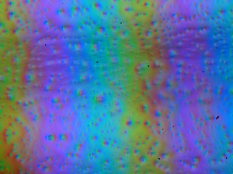 Зерно этих дефектов в несколько раз меньше размеров субпикселей (масштаб этих двух фотографий примерно одинаковый), поэтому фокусировка на микродефектах и «перескок» фокуса по субпикселям при изменении угла зрения выражены слабо, из-за этого нет и «кристаллического» эффекта.