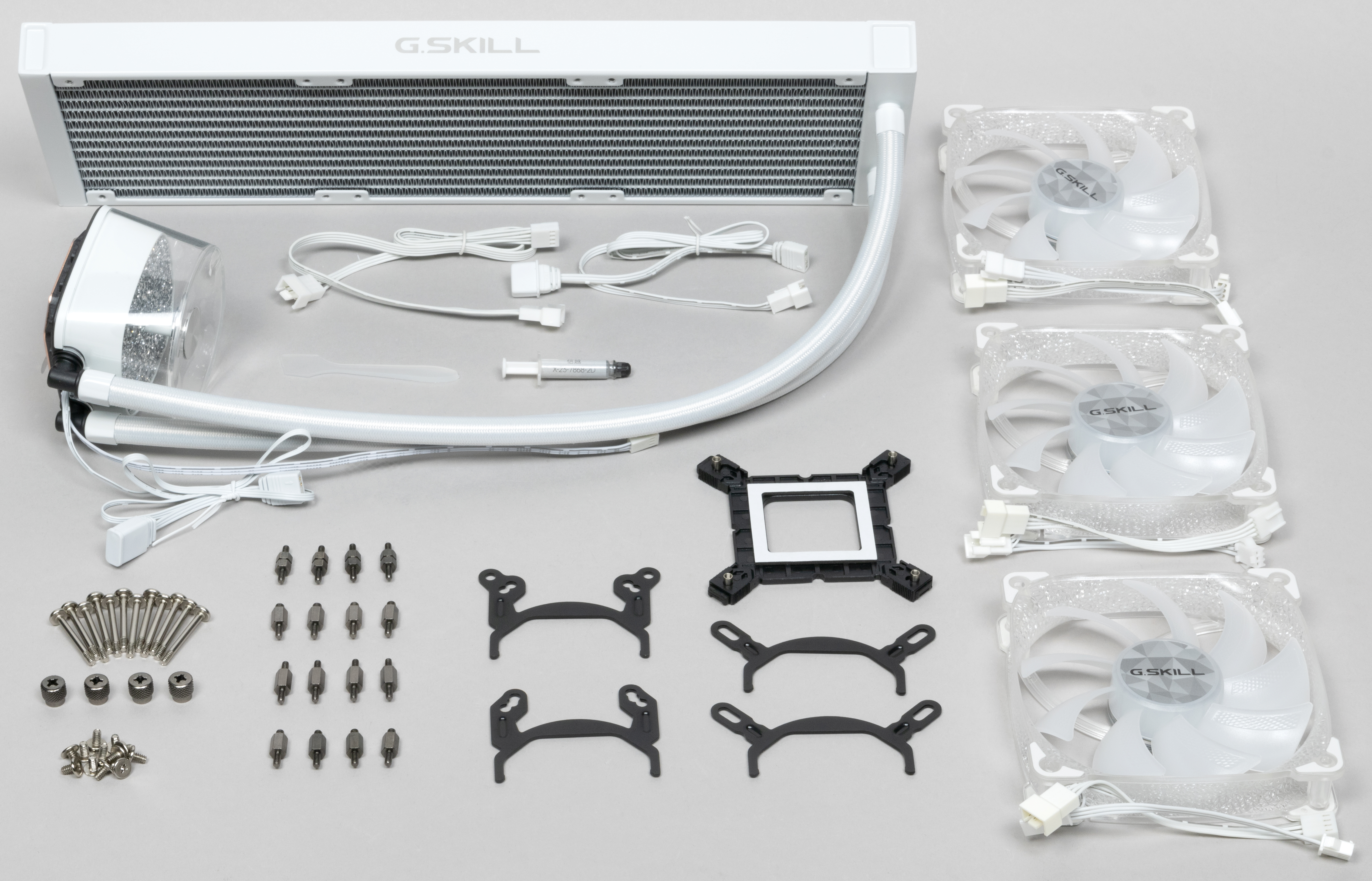 На основе системы жидкостного охлаждения G.Skill Royal Shield 36W условно бесшумный компьютер (уровень шума 25 дБА и ниже) можно создать, только снизив напряжение питания помпы, что, впрочем, не сильно ухудшает ее эффективность при низких скоростях вращения вентиляторов. Главным критерием выбора этой СЖО явно будет ее внешний вид. Она необычно белая, местами искрящаяся и с красочной многоцветной и многозонной статической или динамической подсветкой помпы и вентиляторов. Отметим, что контроллера подсветки в комплекте нет, СЖО подключается к стандартному разъему ARGB на материнской плате.