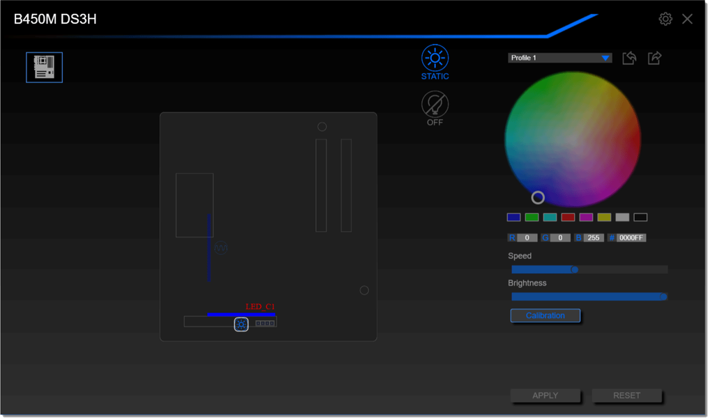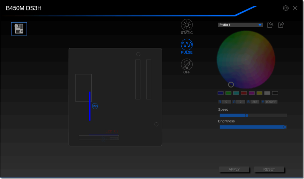Утилита задает режимы работы световой полосы у аудиотракта и устройств (лент, вентиляторов и др), подключенных к выделенному разъему, по отдельности. Встроенная в плату световая полоса имеет очень простые одноцветные светодиоды, и режимов работы всего три: ровное свечение, пульсация или выключение. Для RGB-устройств, подключенных к разъему на плате, режимов предусмотрено больше.