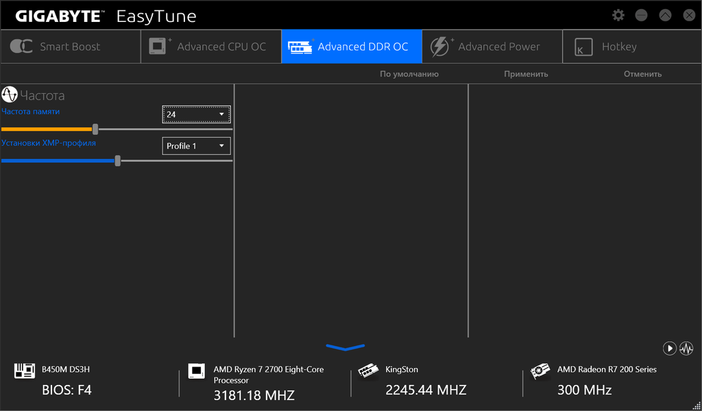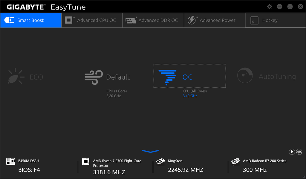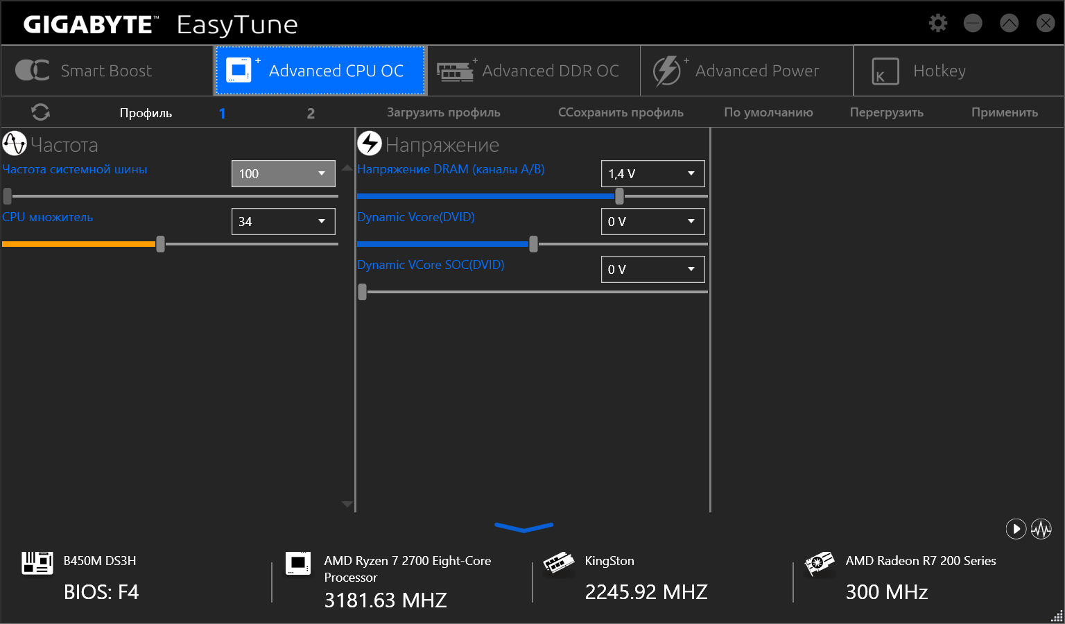 Утилита позволяет осуществлять разгон (поднятие частот, напряжений и пр.) прямо из Windows, не погружаясь в программу настройки BIOS материнской платы. Учитывая бюджетность данной платы и отсутствие нацеленности на разгон, предустановленных вариантов очень мало.
