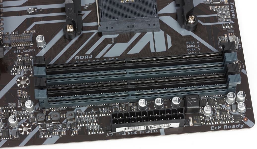Для установки модулей памяти на плате имеется четыре DIMM-слота, для работы памяти в двухканальном режиме в случае использования всего 2 модулей их следует устанавливать в А1 и B1 или А2 и В2. Плата поддерживает небуферизованную память DDR4 (non-EСС), а максимальный объем памяти составляет 64 ГБ (при использовании модулей емкостью по 16 ГБ). По идее, должна быть поддержка и модулей UDIMM на 32 ГБ, однако производитель пока ничего не говорит о такой возможности (впрочем, на момент написания материала стоимость одного такого модуля DIMM превышала суммарную стоимость комплекта из платы и процессора Ryzen 3/5).