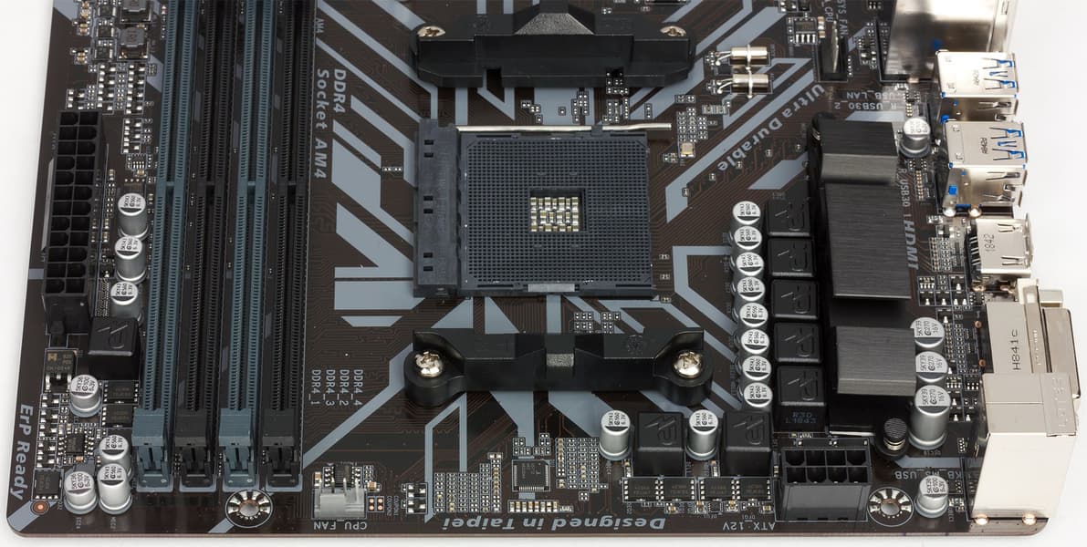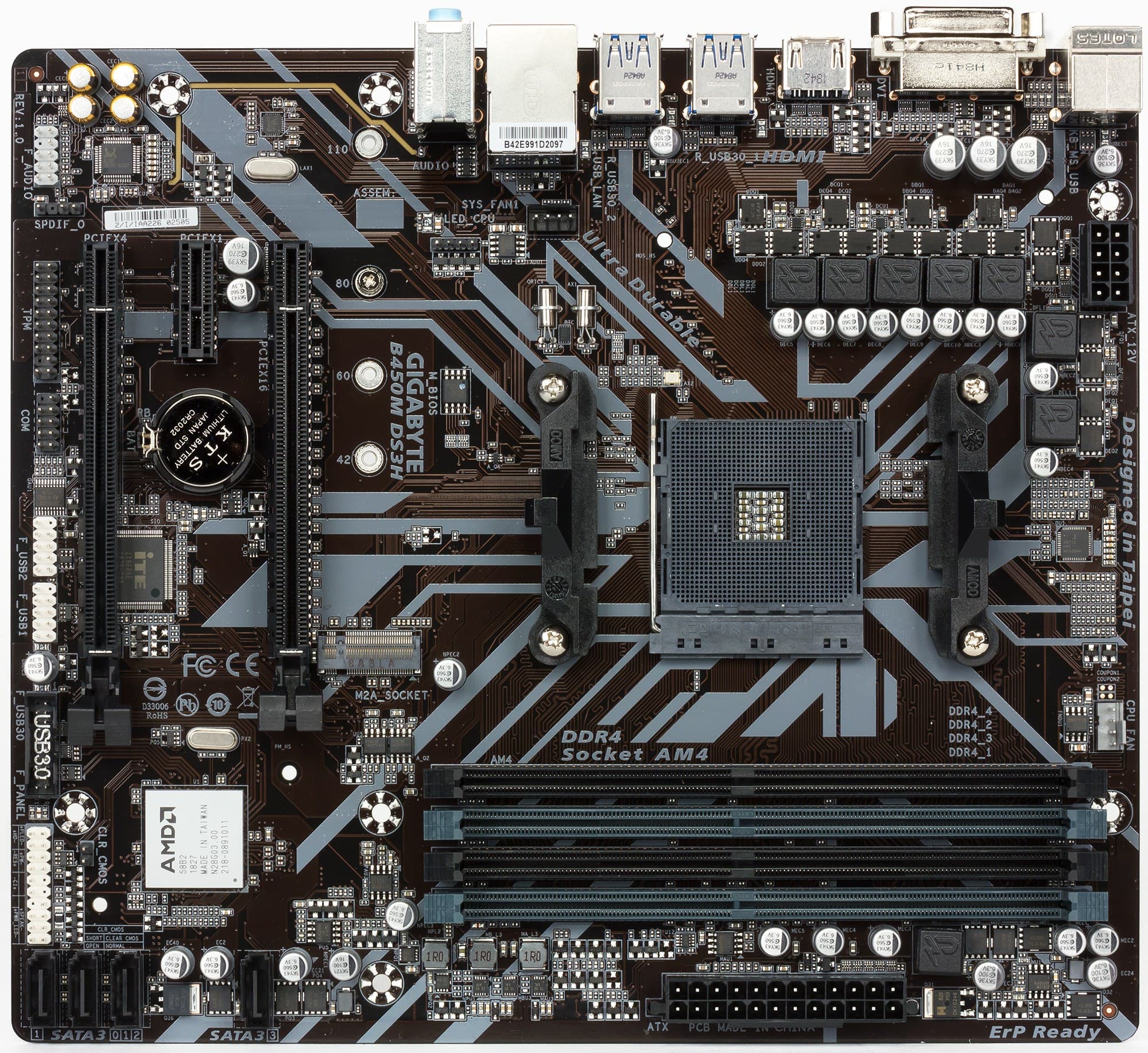 Gigabyte B450M DS3H поддерживает процессоры AMD Ryzen 1-го и 2-го поколений, выполненные под разъем (сокет) AM4. Конечно, имеется и поддержка новых Athlon GE.