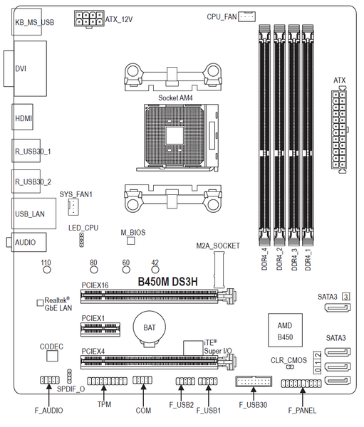 На задней панели платы нашлось место и для порта PS/2. Этот анахронизм может оказаться полезен, когда операционная система при установке не может использовать USB-устройства, и воткнутые в USB мышь и клавиатура оказываются недоступны. (Например, именно это случится, если вы попытаетесь поставить Windows 7 без дополнительных драйверов на компьютер на базе Gigabyte B450M DS3H.) А вот PS/2-периферия работает всегда, если, конечно, она есть у вас под рукой. Также на задней панели имеются видеовыходы HDMI 1.4 и DVI-D для работы видеоядра, встроенного в AMD Ryzen 2-го поколения с графикой Vega.