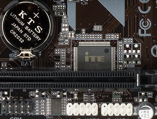 Напоследок — про разъемы для подключения вентиляторов, их на плате всего 2 штуки. CPU Fan предназначен для кулера процессора, а Case Fan — для подключения любого другого вентилятора в корпусе. Мониторинг этих разъемов, а также работу порта PS/2 обеспечивает I/O-контроллер ITE, расположенный около одного из слотов PCI-E x16.