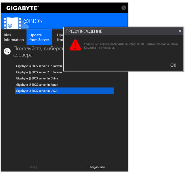 С помощью @BIOS можно обновить прошивку BIOS материнской платы. В нашем случае программа не смогла скачать новую версию прошивки из интернета (при соединении со всеми указанными FTP-серверами возникала ошибка).