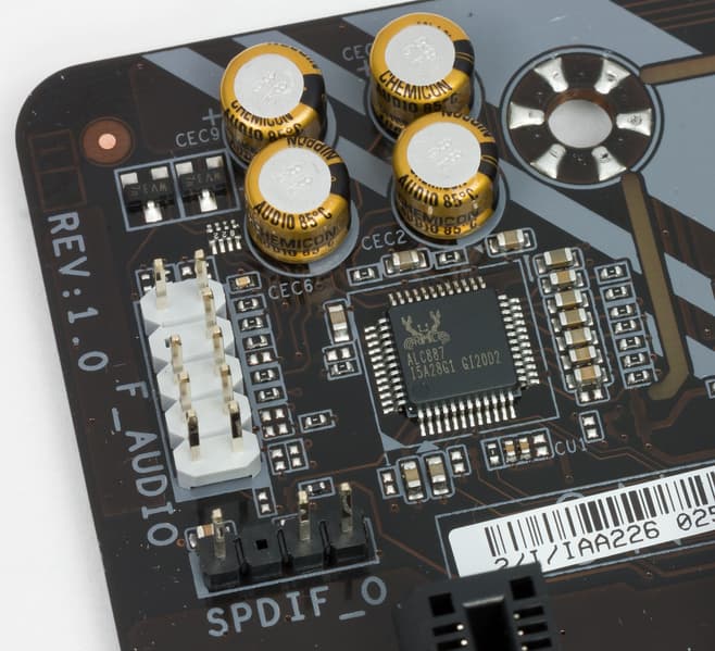 В отличие от дорогих материнских плат, звуком в данном случае заведует не Realtek ALC1220, а Realtek ALC887. Впрочем, для пользователя разница между этими решениями минимальна. Аудиокодек обеспечивает вывод звука по схемам до 5.1.