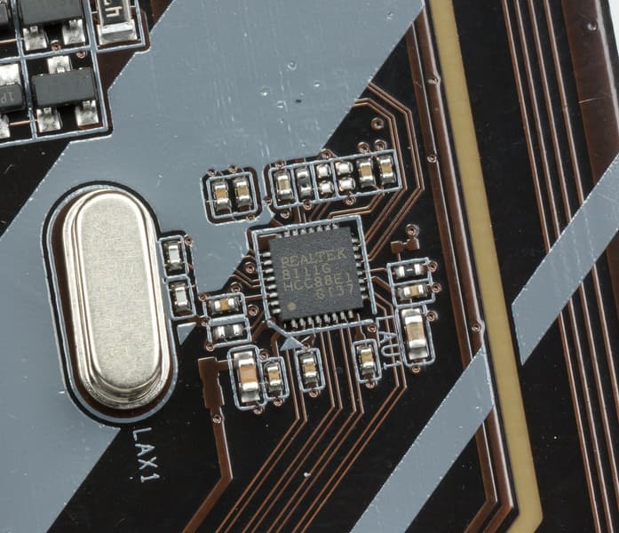 Что касается сетевой поддержки, то на плате распаян сетевой контроллер Realtek 8111G, его разъем RJ-45 тоже имеется на задней панели. Контроллер подключен к чипсету одной линией PCI-E.