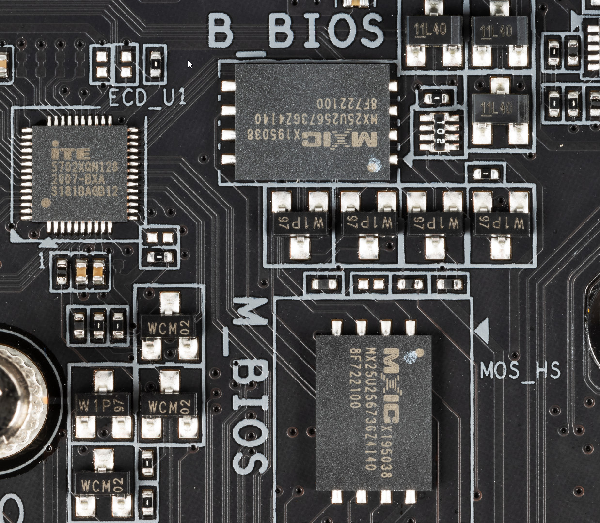 Для размещения прошивки UEFI/BIOS использованы микросхемы MX25U25673G от Macronix. Плата имеет две копии BIOS, поэтому и микросхем две.
