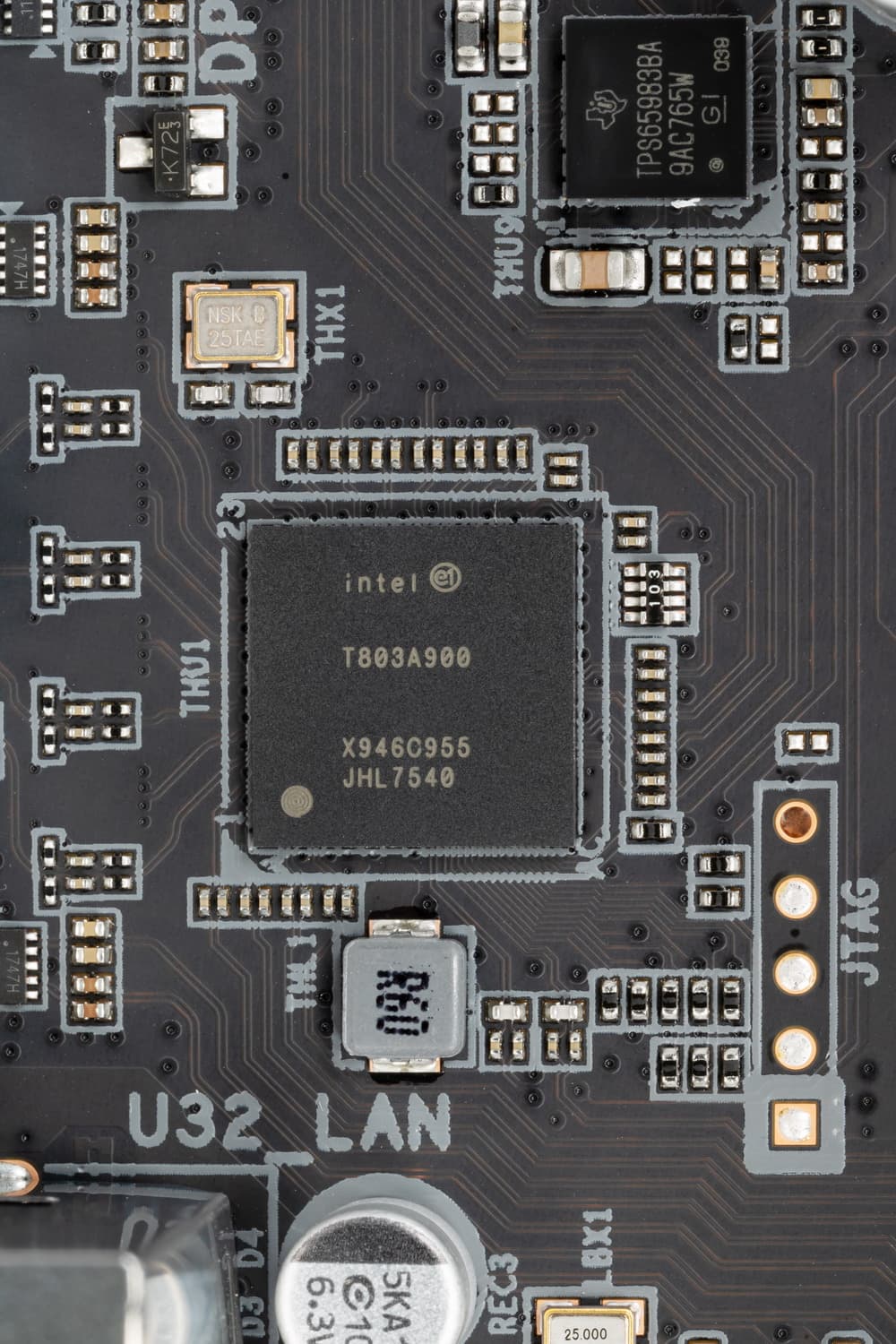 На плате имеется и очень дорогой высокоскоростной контроллер Intel JHL7540, реализующий технологию Intel Thunderbolt3.