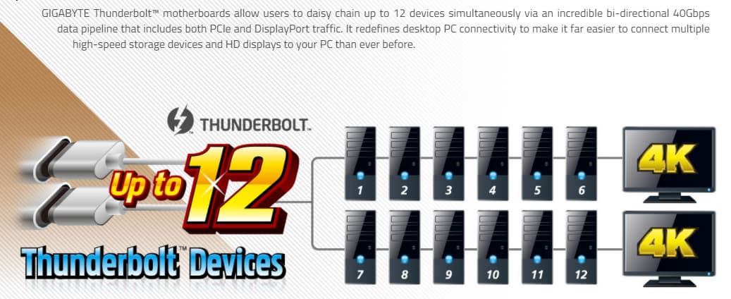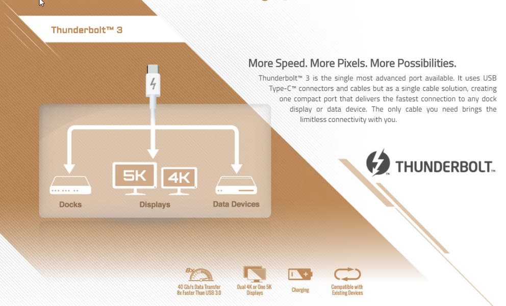 Полагаю, что детали по TB3 не нужны, все и так в курсе этой технологии. Надо сказать, что для полноценной реализации возможностей по выводу огромных разрешений на матплате есть порт DisplayPort, работающий только на прием изображения с видеокарты.
