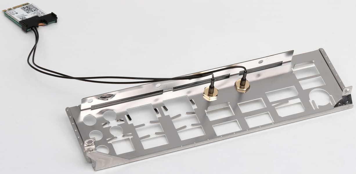 Имеется и комплексный беспроводной адаптер на контроллере Intel AX200NGW, через который реализованы Wi-Fi (802.11a/b/g/n/ac/ax) и Bluetooth 5.0. Он установлен в слот M.2 (E-key), и его разъемы для привинчивания выносных антенн через провода выведены на заднюю панель.