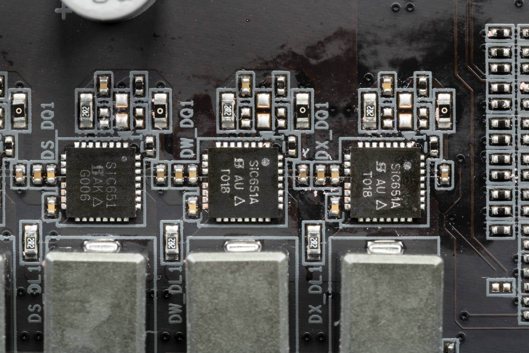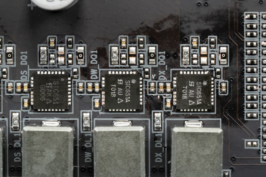 Каждый канал фазы имеет суперферритовую катушку и мосфеты SiC651 и SiC651A, рассчитанные на максимальный ток в 50А от Vishay Siliconix. Суммарный ток, который позволяет данная система питания, может составлять до 600А.