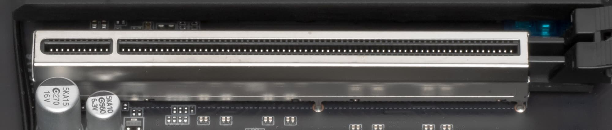 Как и слоты для памяти, два первых слота PCIe x16 имеют металлическое армирование из нержавеющей стали, которое увеличивает их надежность (что может быть важным в случае довольно частой смены видеокарт, но что более важно: такие слоты легче выдержат нагрузку на изгиб в случае установки очень тяжелых видеокарт топового уровня). Кроме того, такая защита предохраняет слоты от электромагнитных помех.