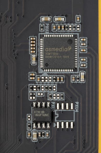 При этом на оба эти контроллера тратится всего одна PCIe линия от B550, поскольку ее потребляет промежуточный процессор ASM1184e от вездесущей ASMedia.