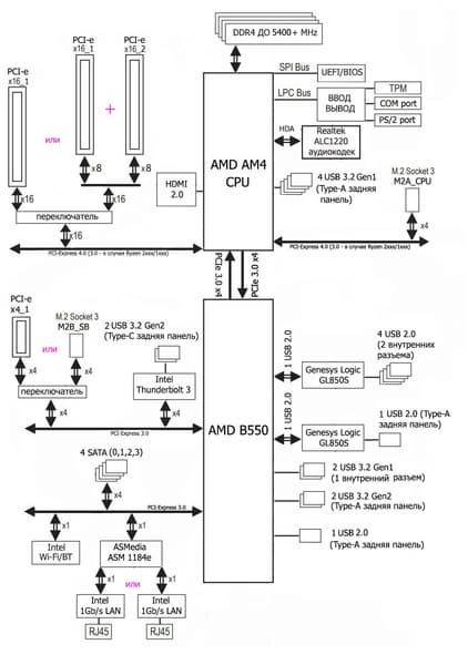 В свою очередь чипсет B550 поддерживает в сумме 18 линий PCIe 3.0. Из них опять же 4 нужны для связи с CPU. Осталось 14 линий ввода-вывода, из которых 4 заняты портами SATA, а остальные 10 линий могут свободно конфигурироваться. Понятно, что скорее всего будет дефицит линий PCIe для размещения всей нужной периферии, и придется делить ресурсы.