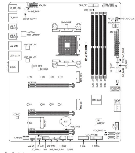 | USB-порты | 4 × USB 2.0: 2 внутренних разъема на 4 порта (Genesys Logic GL850S) 1 × USB 2.0: 1 порт Type-A (черный) на задней панели (Genesys Logic GL850S) 1 × USB 2.0: 1 порт Type-A (черный) на задней панели (B550) 2 × USB 3.2 Gen1: 1 внутренний разъем на 2 порта (B550) 4 × USB 3.2 Gen1: 4 порта Type-A (синие) (CPU) 2 × USB 3.2 Gen2: 2 порта Type-A на задней панели (красные) (B550) 2 × USB 3.2 Gen2: 2 порта Type-C на задней панели (Intel Thunderbolt 3) |