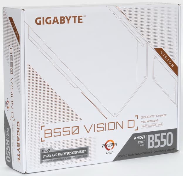 Gigabyte B550 Vision D поставляется в стандартной картонной коробке с совершенно новым дизайном для серии Vision. За основу был взят белый цвет, а черный логотип компании стал коричневым. Вероятно под игру с логотипом Ryzen от AMD.