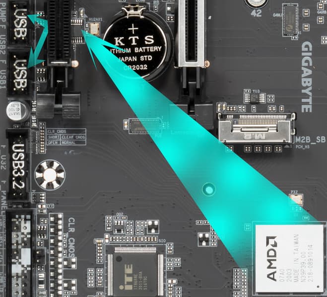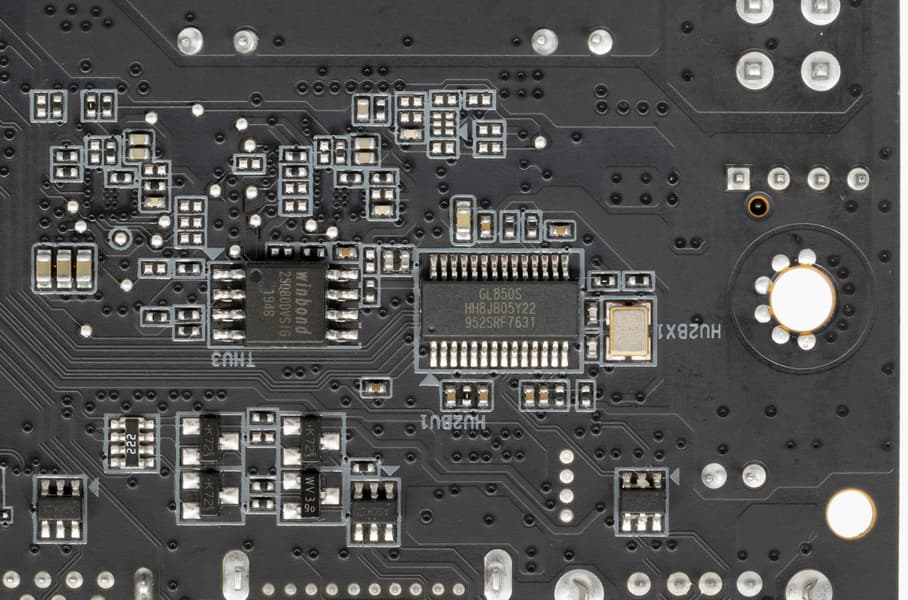 - 6 портов USB 2.0/1.1: 4 реализованы через контроллер Genesys Logic GL850S (его тщательно «запихнули» прямо под слот PCIe (на него потрачен 1 порт USB 2.0 от B550) и представлены двумя внутренними разъемами (каждый на 2 порта); еще 1 реализован через другой контроллер Genesys Logic GL850S (на него потрачен 1 порт USB 2.0 от B550) и представлен портом Type-A на задней панели (черный); и еще 1 реализован через B550 и также представлен портом Type-A на задней панели (черный, он используется для Q Flash BIOS).