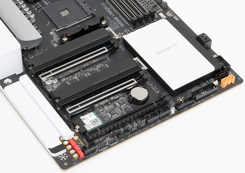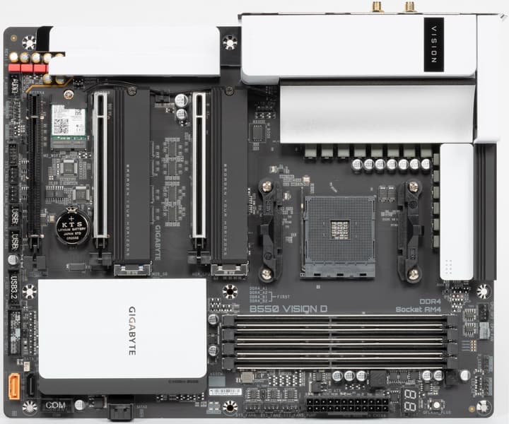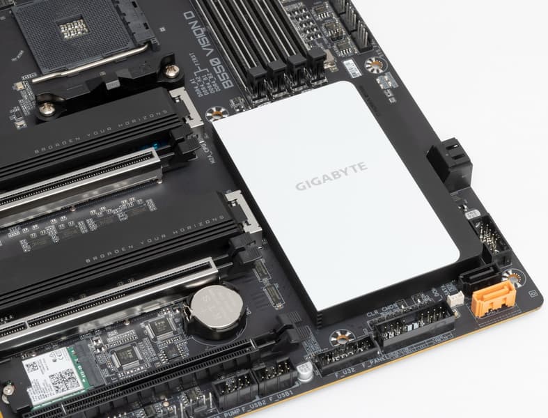 Gigabyte B550 Vision D — материнская плата из серии Vision на среднебюджетном чипсете. Ее средняя цена на момент подготовки обзора — в районе 20 тысяч рублей. Плата серьезная и стильная черно-белая. Функциональность у нее отличная: 16 портов USB разных видов (включая 4 самых быстрых USB 3.2), 2 высокоскоростных порта Thunderbolt3 (да-да, Intel Titan Ridge, как застенчиво написано в руководстве), 4 порта SATA, два проводных гигабитных сетевых контроллера и беспроводной Wi-Fi 802.11ac + Bluetooth 5.0, два слота M.2 (один из них подключен к процессору и может воспользоваться преимуществами PCIe 4.0), плюс, конечно же, два слота PCIe x16 для видеокарт, также поддерживающие PCIe 4.0 (при установке процессоров серии Ryzen 3000). Система питания способна обеспечить работу любых совместимых процессоров в турборежиме. Плата имеет 8 разъемов для подключения вентиляторов и помп, радиаторами оснащены все накопители в слотах M.2.