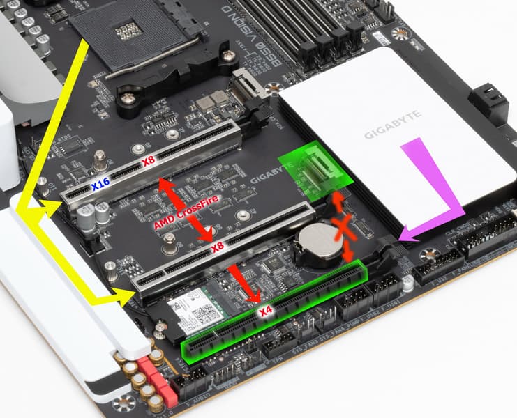 Всего на плате есть 3 слота PCIe: два PCIe x16 (для видеокарт) и один PCIe x4 (несмотря на то, что он выполнен в форм-факторе x16). Если про первые PCIe x16 я выше уже рассказал (они подключены к CPU), то PCIe x4 подключен к B550 и при этом делит ресурсы со слотом M.2 (M2B_SB). Очевидно, что если потребуется задействовать больше одного M.2 слота, то третий «длинный» слот PCIe будет заблокирован.А в обратном случае возможна установка трех видеокарт и активизацию на них AMD CrossFire. Почему-то нет поддержки Nvidia SLI, при этом на других материнках на В550 таковая имеется.