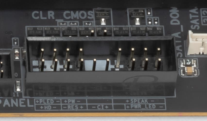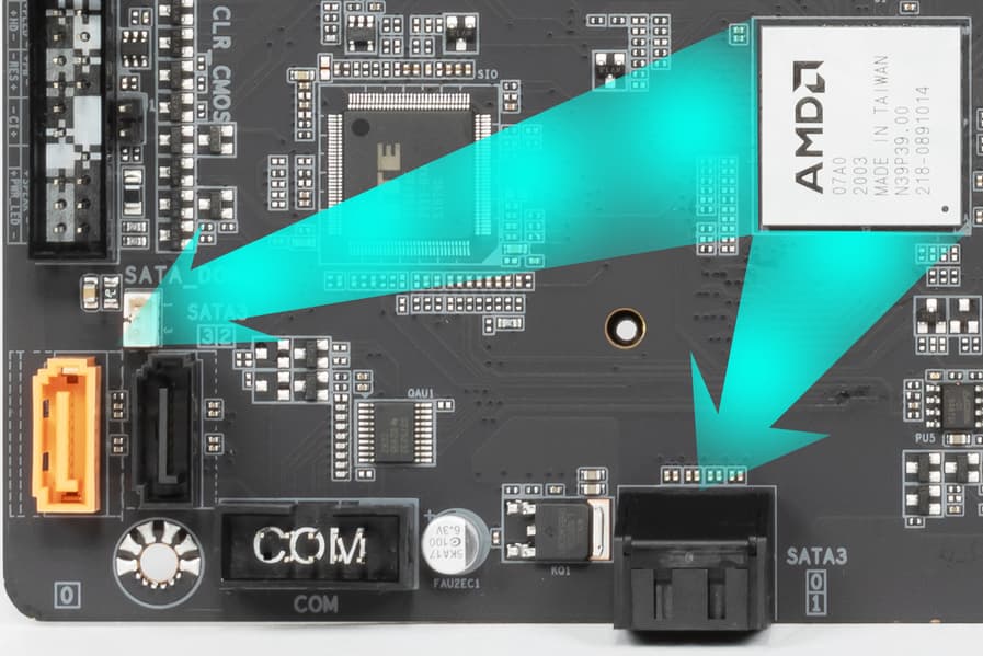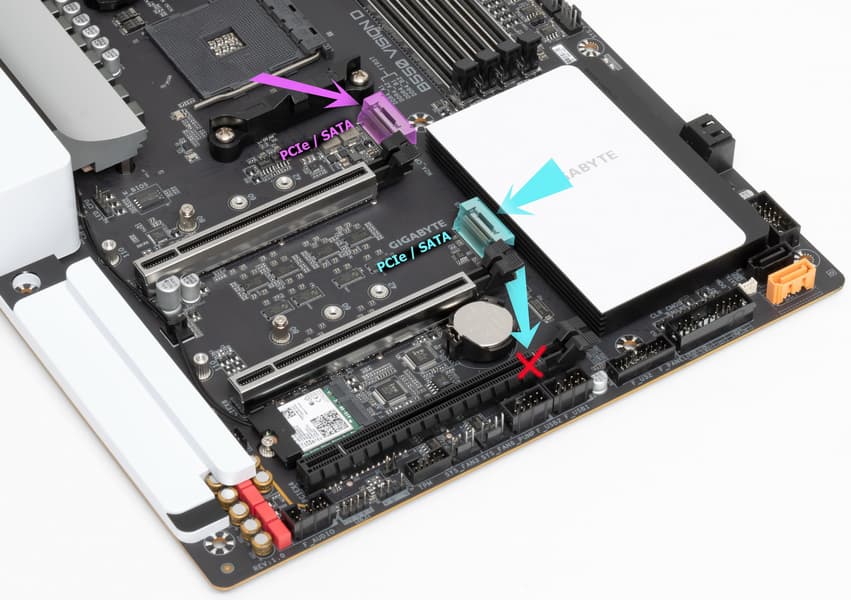 Всего у платы 4 разъема Serial ATA 6 Гбит/с + 2 слота для накопителей в форм-факторе M.2. (Еще один слот M.2, занят контроллером беспроводных сетей Wi-Fi/Bluetooth.). 4 порта SATA реализованы через чипсет B550 и поддерживают создание RAID. Размещены попарно по разным углам печатной платы, причем как в горизонтальной, так и в вертикальной ориентациях. Один из портов (SATA_3) имеет поддержку SATA DOM (Disk On Module).