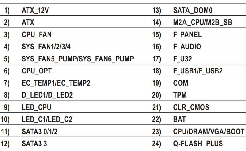 | Прочие внутренние элементы | 24-контактный разъем питания ATX 1 8-контактный разъем питания EPS12V 1 слот M.2 (E-key), занят адаптером беспроводных сетей 1 разъем для подключения 2 портов USB 3.2 Gen1 2 разъема для подключения 4 портов USB 2.0 8 разъемов для подключения 4-контактных вентиляторов и помп ЖСО 2 разъема для подключения неадресуемой RGB-ленты 2 разъема для подключения адресуемой ARGB-ленты 1 разъем аудио для передней панели корпуса 1 кнопка перепрошивки FlashBIOS 1 разъем TPM 2 разъема для подключения управления с передней панели корпуса 2 разъема подключения термодатчика |