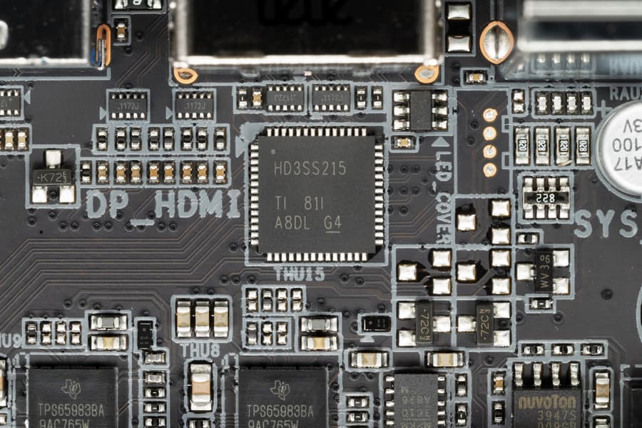 Поскольку в 3-м поколении процессоров Ryzen уже есть решения с интегрированным GPU, то наряду с DisplayPort In (работающим только на прием графики) у материнской платы имеется вывод встроенной в CPU графики по HDMI. Для реализации вывода по версии HDMI 2.1 предусмотрен контроллер HD3SS215 от Texas Instruments.