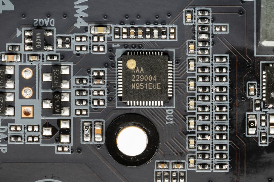 Аудиотракт вынесен на угловую часть платы, не пересекается с другими элементами. Разумеется, левый и правый каналы разведены по разным слоям печатной платы. Все аудиоразъемы на задней панели имеют привычную нам цветовую окраску, что дает возможность легко ориентироваться без чтения надписей.