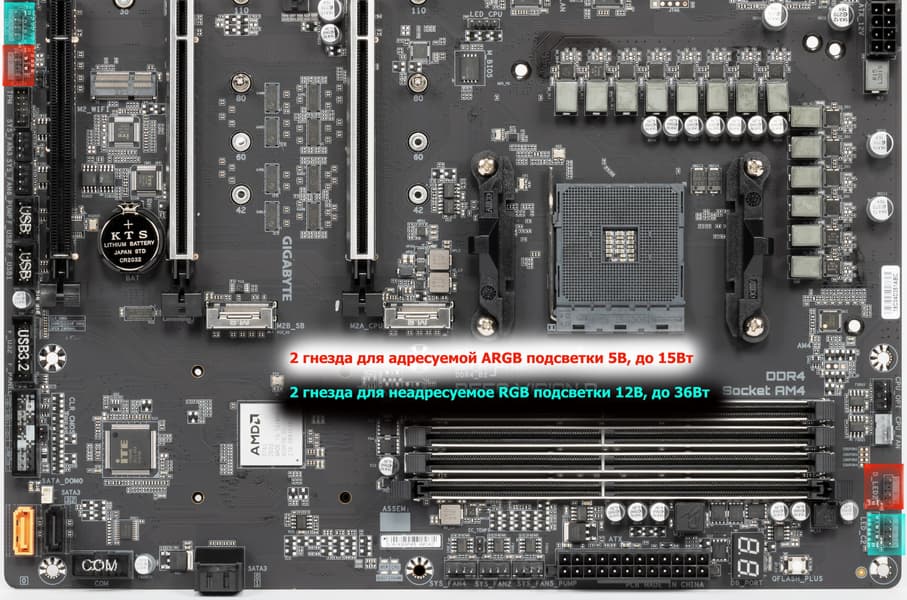Продолжая разговор о световых индикаторах, надо упомянуть и возможности материнской платы по подключению RGB-подсветки. Имеется четыре разъема для подключения любых устройств этого плана: 2 разъема для подключения адресуемых (5 B 3 A, до 15 Вт) ARGB-лент/устройств и 2 разъема неадресуемых (12 В 3 А, до 36 Вт) RGB-лент/устройств. Разъемы объединены в пары (RGB+ARGB), разнесенные на противоположные края платы.