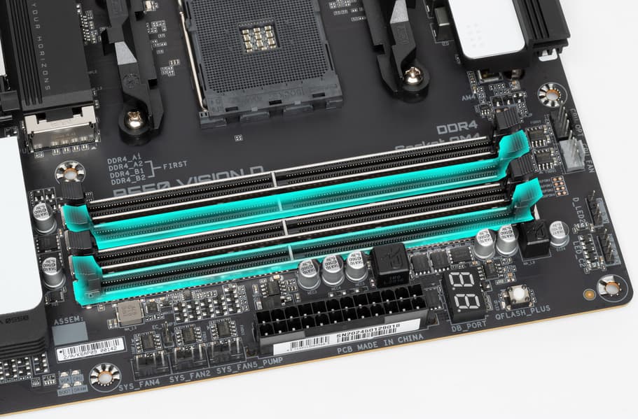 Для установки модулей памяти на плате Gigabyte имеется четыре DIMM-слота (для работы памяти в Dual Channel в случае использования всего 2 модулей их следует устанавливать в А2 и B2. Плата поддерживает небуферизованную память DDR4 (поддерживаются как non-EСС, так и ECC), а максимальный объем памяти составляет 128 ГБ (при использовании UDIMM последнего поколения по 32 ГБ). Разумеется, поддерживаются профили XMP.