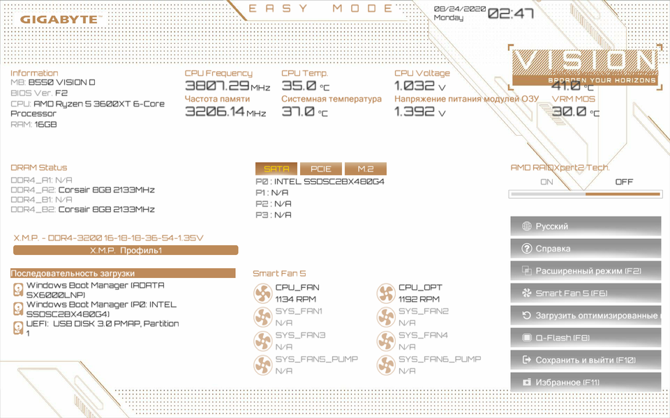 Еще раз надо напомнить, что Gigabyte B550 Vision D поддерживает процессоры AMD Ryzen 3-го поколения, выполненные под разъем (сокет) AM4. Но, как показала практика, процессоры предыдущих поколений также поддерживаются.