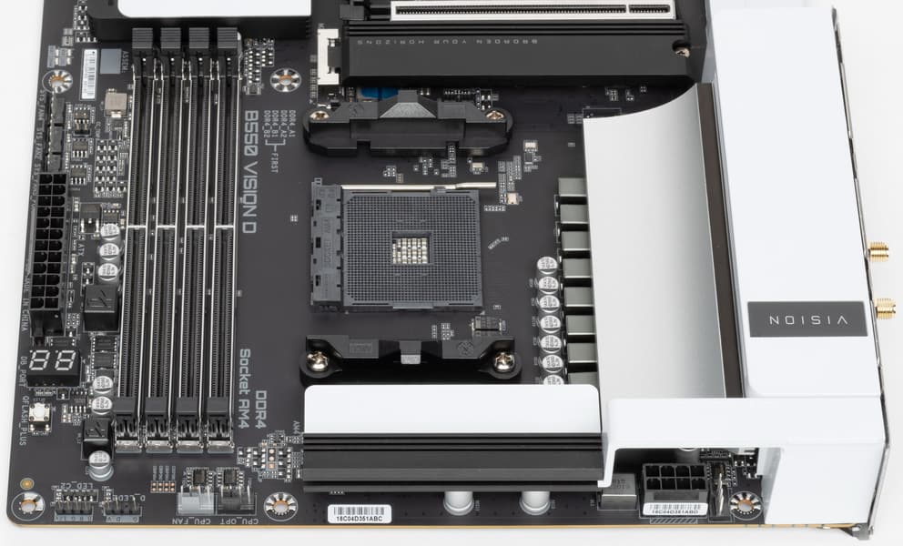 Форм-фактор ATX имеет размеры до 305×244 мм, а E-ATX — до 305×330 мм. Материнская плата Gigabyte B550 Vision D имеет размеры 305×244 мм, поэтому выполнена в форм-факторе ATX, и на ней имеются 9 монтажных отверстий для установки в корпус. Правда для использования одного из них (около 8-контактного разъема питания EPS12V) придется снять элемент дизайна, прикрывающий и разъем, и отверстие.