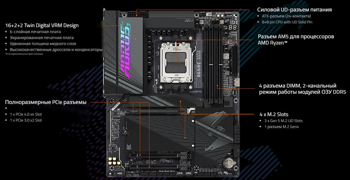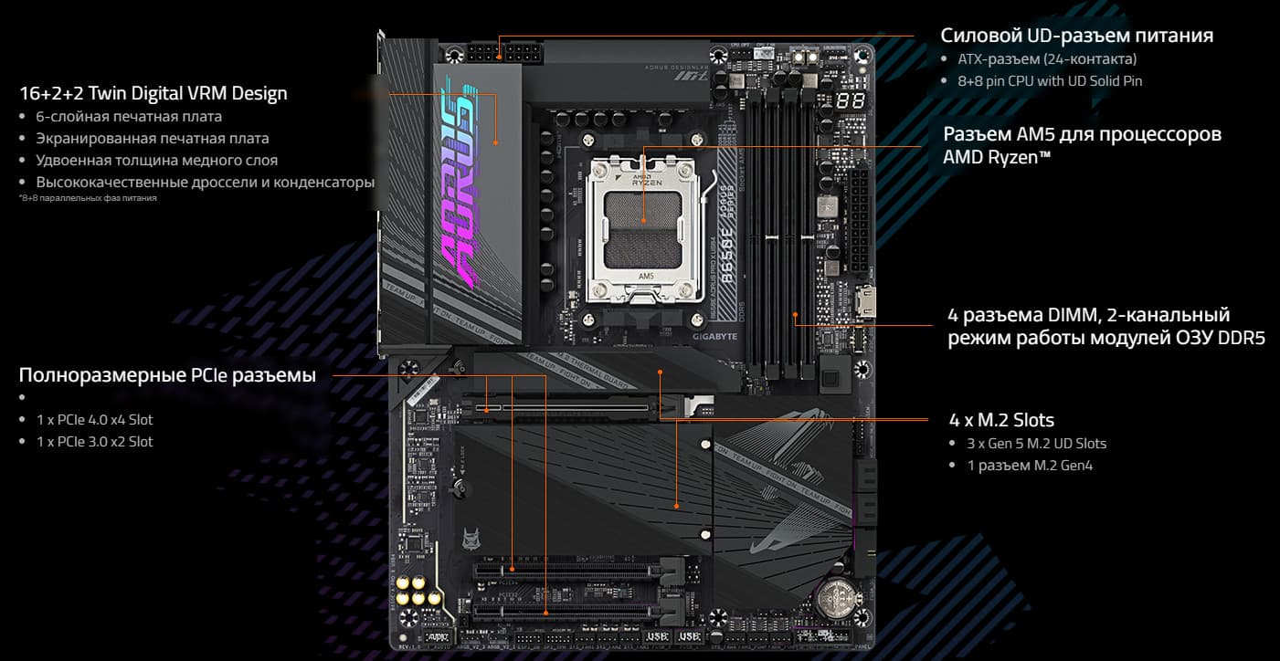 | Поддерживаемые процессоры | AMD Ryzen 7xxx/8xxx/9xxx под AM5 |