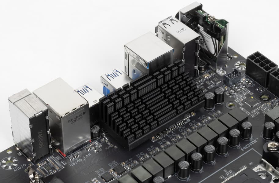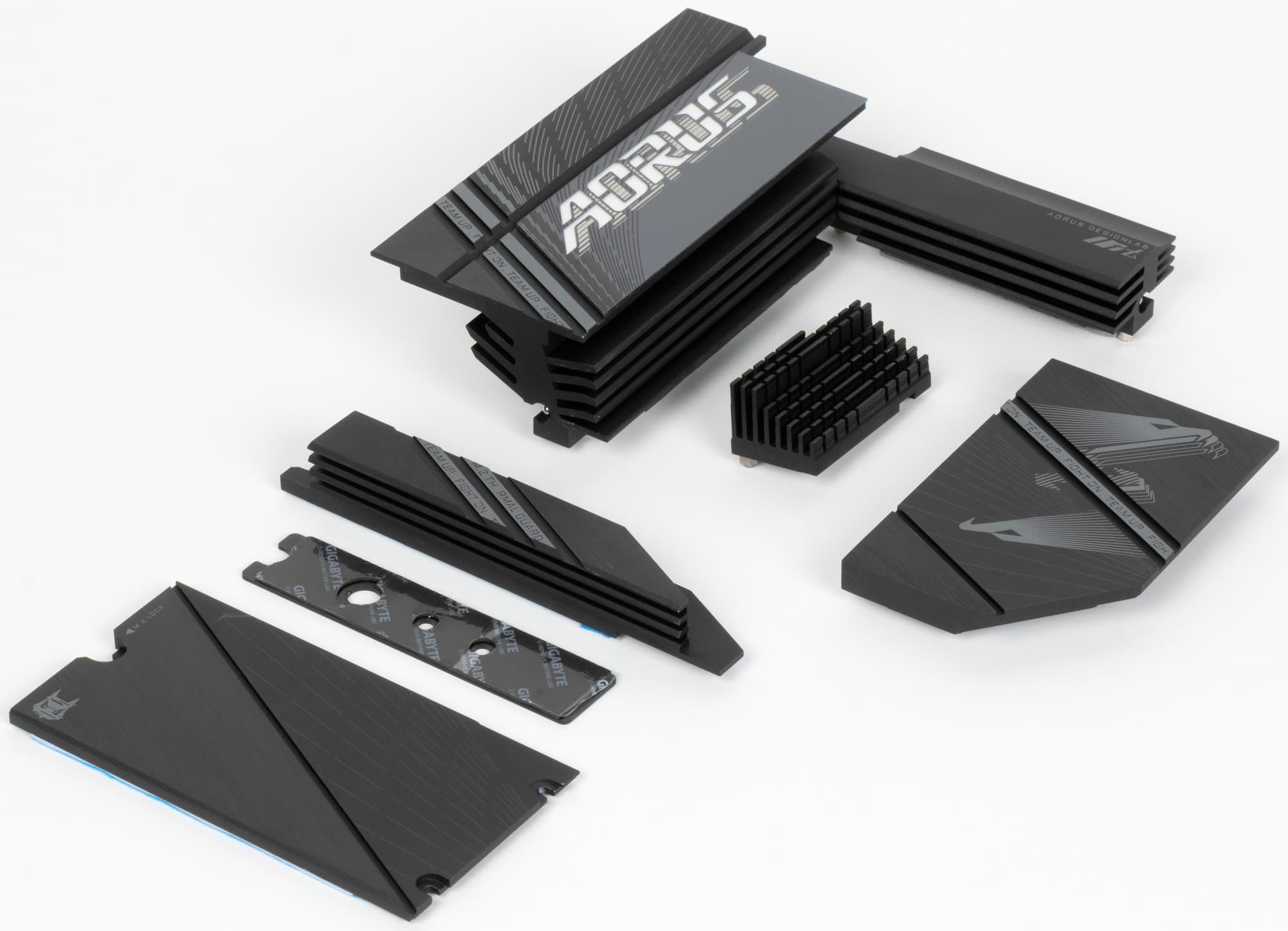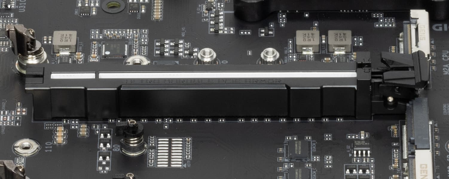 Все M.2 слоты имеют радиаторы. Верхний M2A_CPU обладает отдельным радиатором, когда как остальные M.2 имеют общий радиатор.