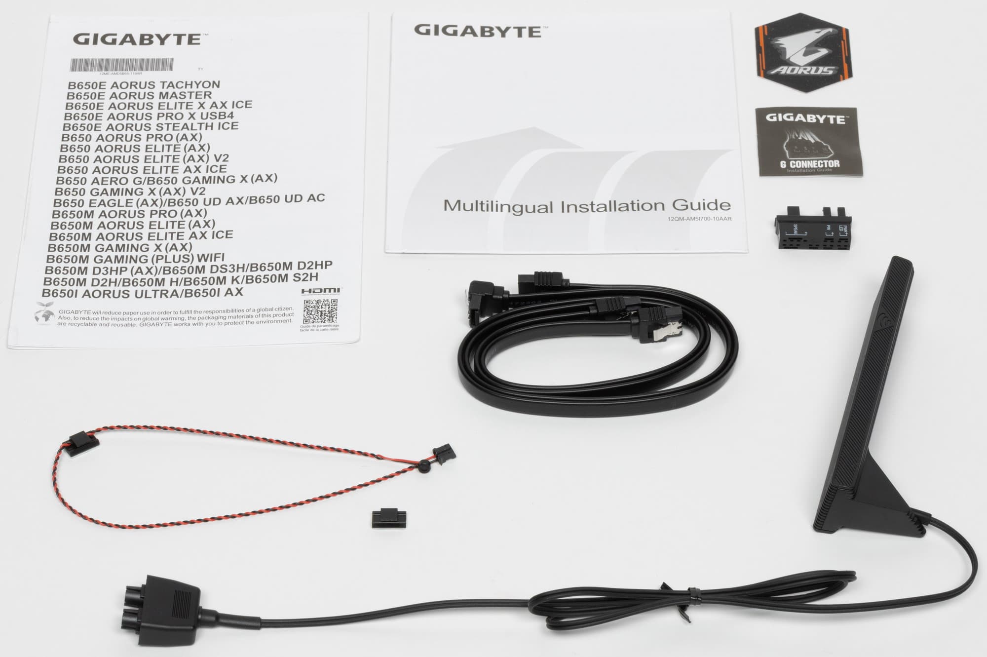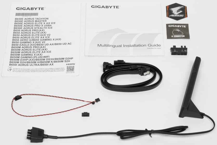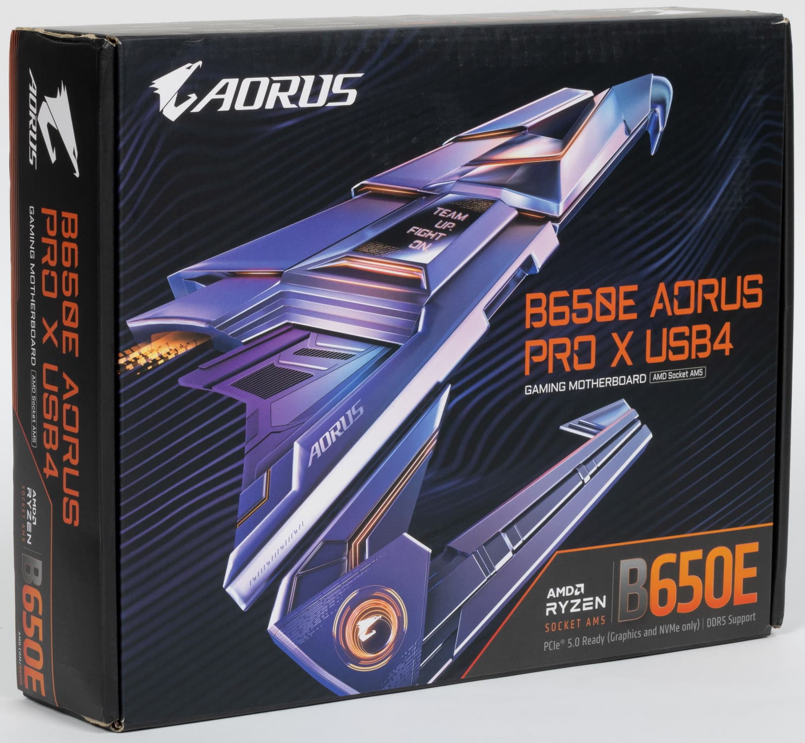 Gigabyte B650E Aorus Pro X USB4 поставляется в традиционной для Aorus коробке из жесткого картона с фирменным орлиным дизайном серии. Комплект размещен под платой в отдельных отсеках.