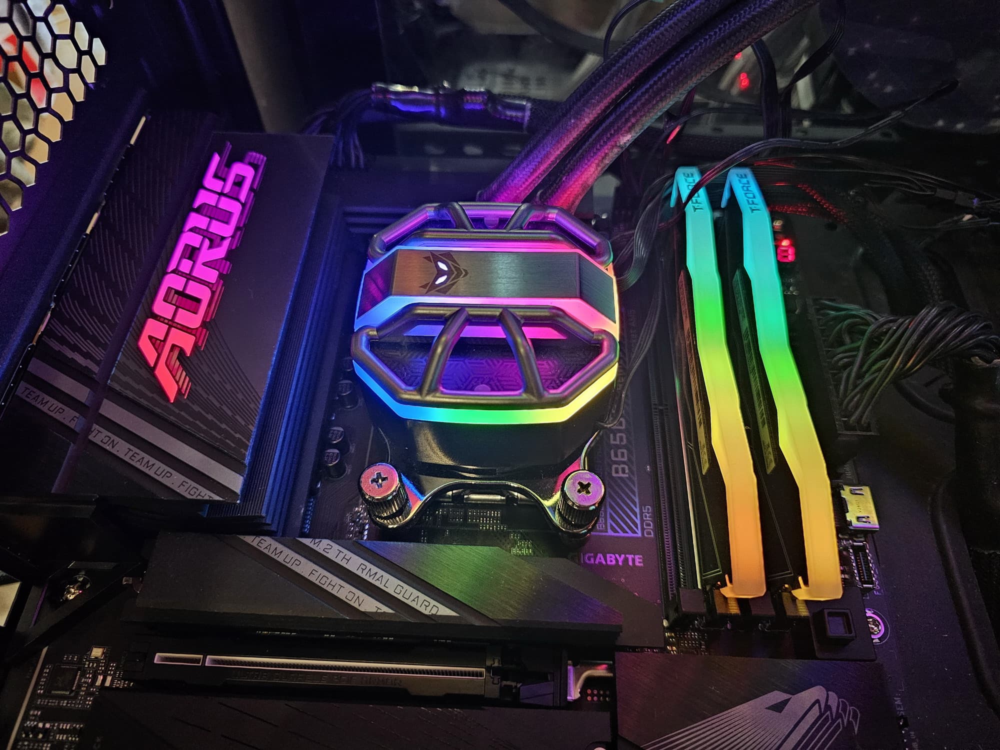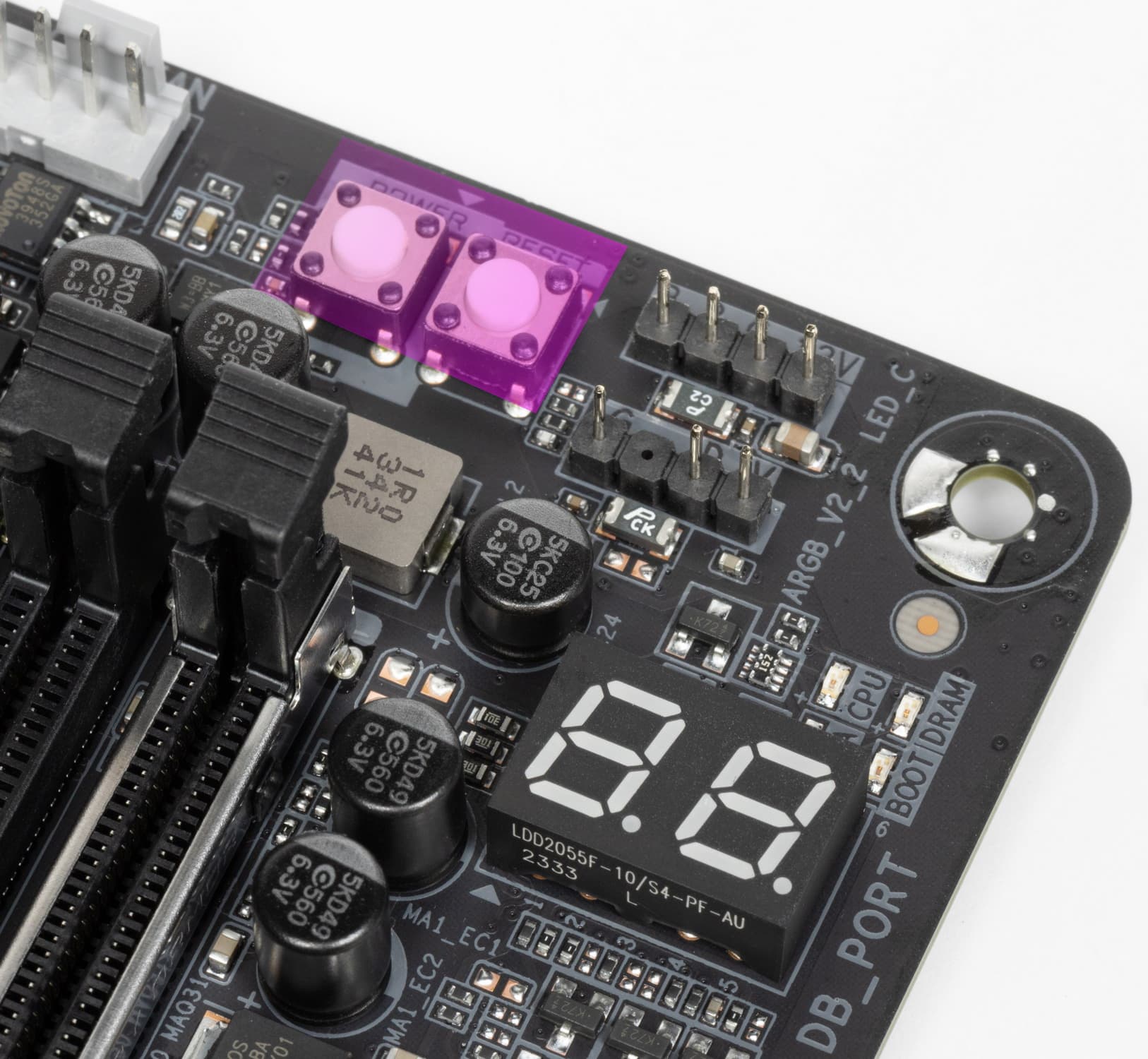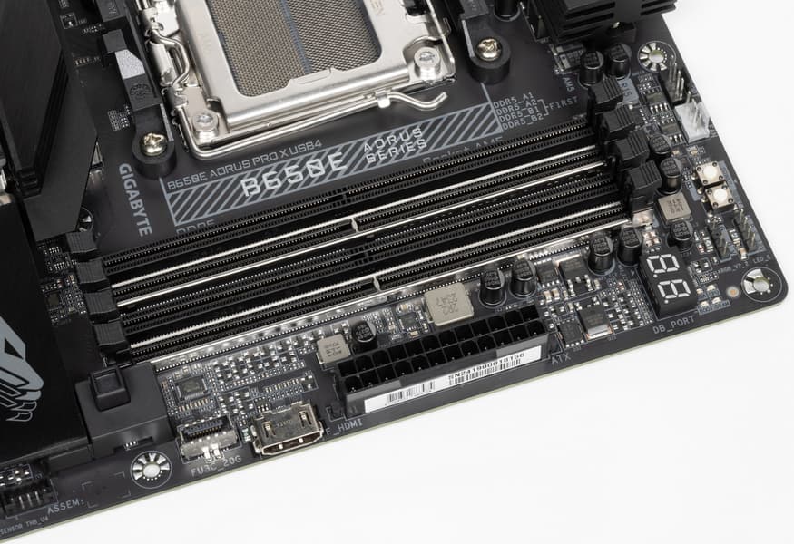 Для установки модулей памяти на плате имеется четыре DIMM-слота (для работы памяти в Dual Channel в случае использования всего 2 модулей их следует устанавливать в А2 и B2, они выделяются тем, что имеют металлическую окантовку). Плата поддерживает небуферизованную память DDR5, а максимальный объем памяти составляет 192 ГБ. Поддерживаются профили XMP и Expo.